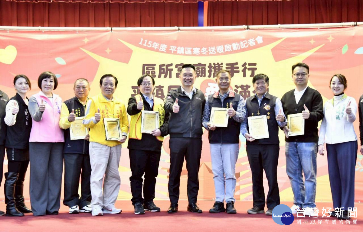 平鎮區寒冬送暖啟動記者會參與人員大合照。<br />