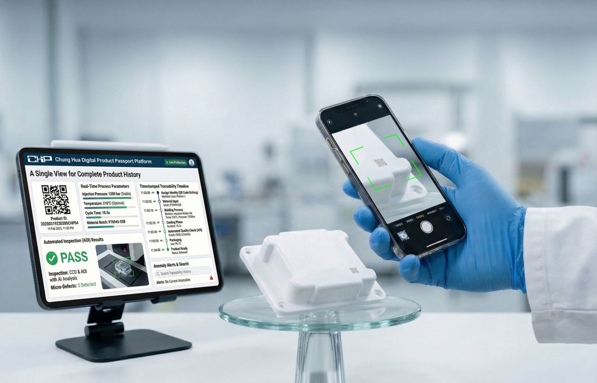 中華塑膠此次獲獎的數位製造護照系統,核心在於「單件製造單元、全流程可追溯」的設計理念。透過將射出製程參數、原料批次、機台資訊、AOI 自動光學檢測結果與完整生產履歷,逐一綁定至每一件產品,不僅可即時掌握品質狀態,也能在發生異常時快速進行根因分析,大幅縮短調查與處置時間。