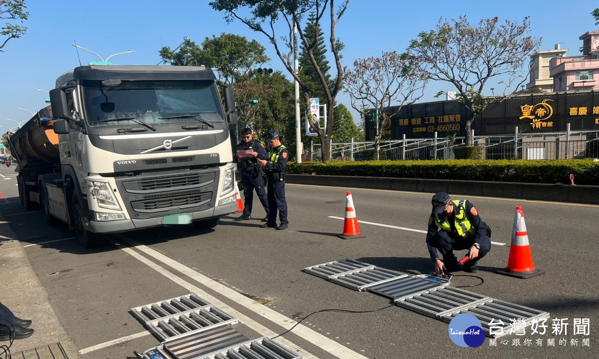 維護道路品質及確保用路人行車安全,中壢警分局配合交通警察大隊直屬中隊,於15日上午在轄內大型車輛經常通行之重要幹道,規劃執行大型車專案取締勤務,並運用移動式地磅設備,針對砂石車、大貨車等大型車輛加強稽查超載及相關違規情形。