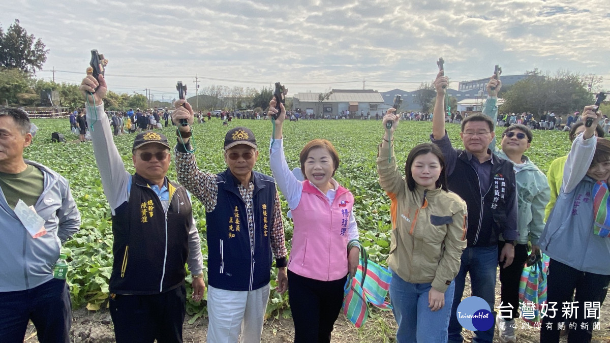 立委楊瓊瓔與梧棲區農會總幹事吳柏慧等人一同鳴槍宣布開拔蘿蔔。
