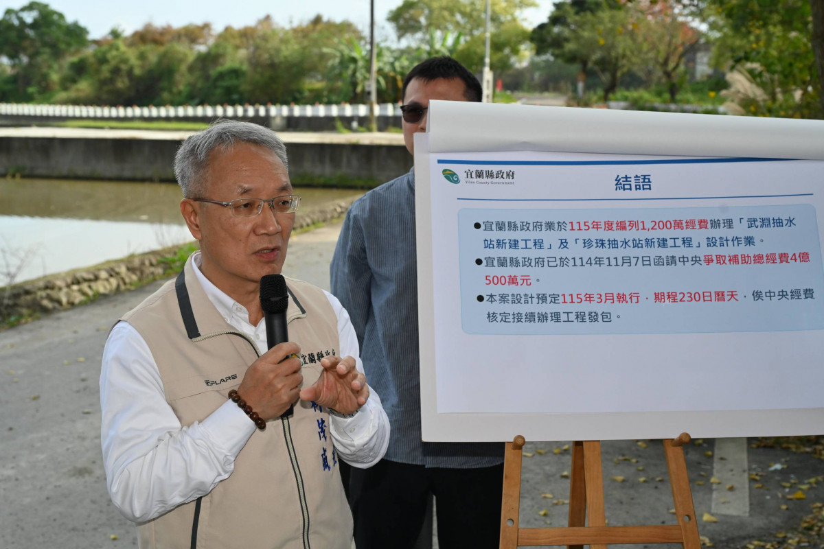 宜蘭縣冬山河左岸地區地勢低窪,颱風與豪雨期間常因外水頂托造成局部地區積淹水。歷年颱風豪雨期間,武淵及珍珠地區曾發生嚴重水患,且因屬長延時淹水特性,退水時間長達1至3日,影響面積廣達250公頃。經過規劃檢討,鑒於既有重力排水功能受限,宜蘭縣政府積極推動抽水站及排水系統改善工程,規劃設置固定式抽水站以補強防災效益,並於114年11月7日向中央爭取補助「武淵抽水站新建工程」及「珍珠抽水站新建工程」經費共計4億500萬元,為加速工程推動進程,本府已於115年度預算中分別編列600萬元設計經費,先行發包辦理規劃設計,俟中央核定補助後,接續辦理工程發包。