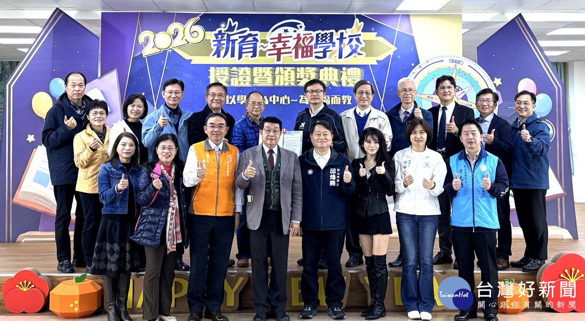 新北市教育局今(20)日於自強國小舉辦「新育幸福學校認證」授證儀式。歷經一年的審查與輔導,參與的10所學校全數通過認證,其中7校獲最高等第「三星」、3校獲「二星」,展現新北校園以學生為核心、兼顧科技應用與人文關懷的教育實踐成果。