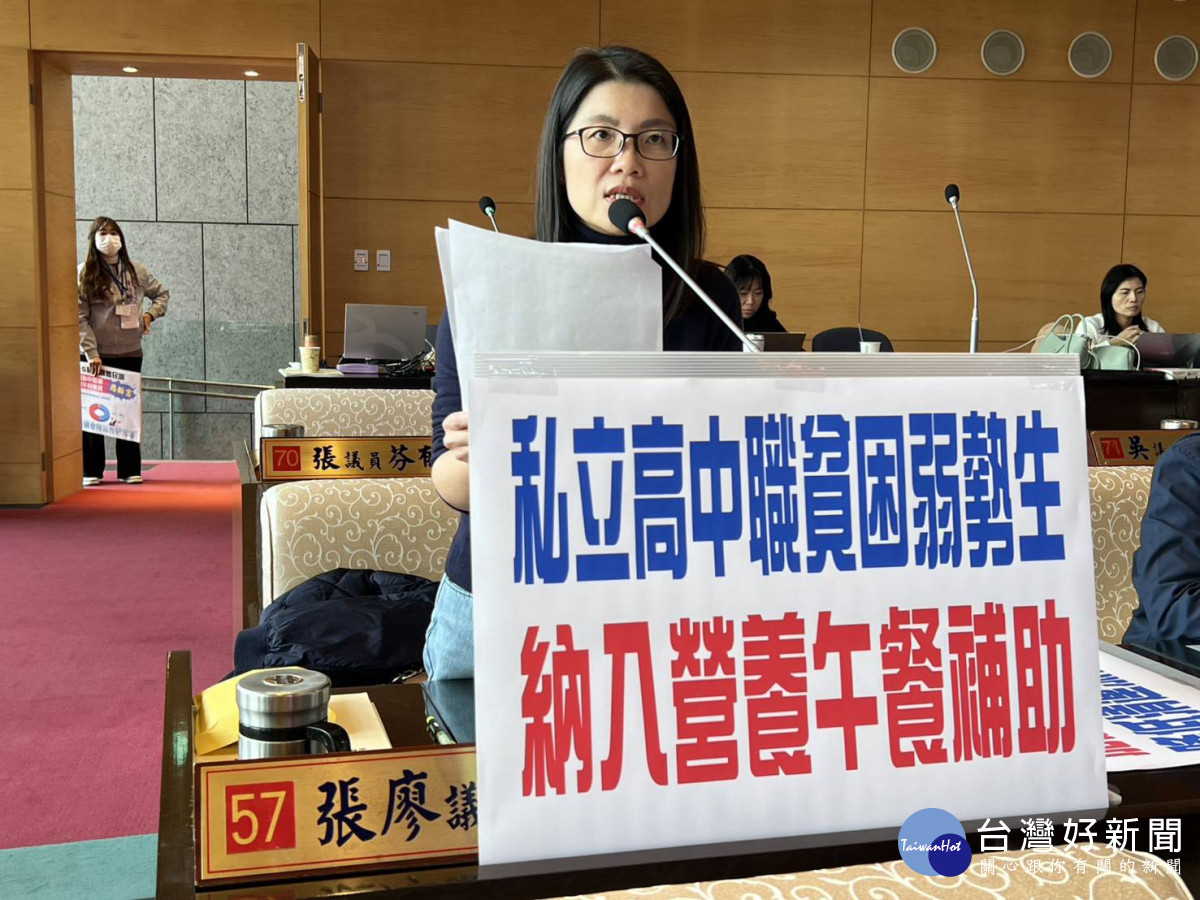 張廖乃綸還強調,目前台中市政府僅針對台中市公立高中及國中小經濟貧困學生補助營養午餐,事實上,私立高中職不少學生都來自經濟弱勢家庭,這些孩子因考試成績分發進入私立高中職就讀,有時候下課還要去打工補貼家用,與家境優渥的孩子選擇就讀私校情況不同,市府應該將私立高中職的貧困弱勢學生納入營養午餐補助對象,市議員陳廷秀也表示支持。教育局長蔣偉民表示,台中市私立高中職的學生數約38000多人,推估家庭經濟弱勢的學生約5600人,市府後續會進一步評估。