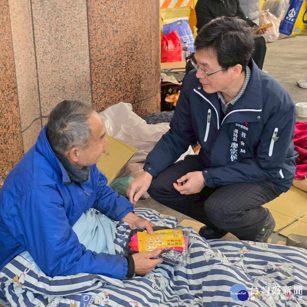 台中市社會局啟動低溫關懷,走上街頭發放禦寒物資。