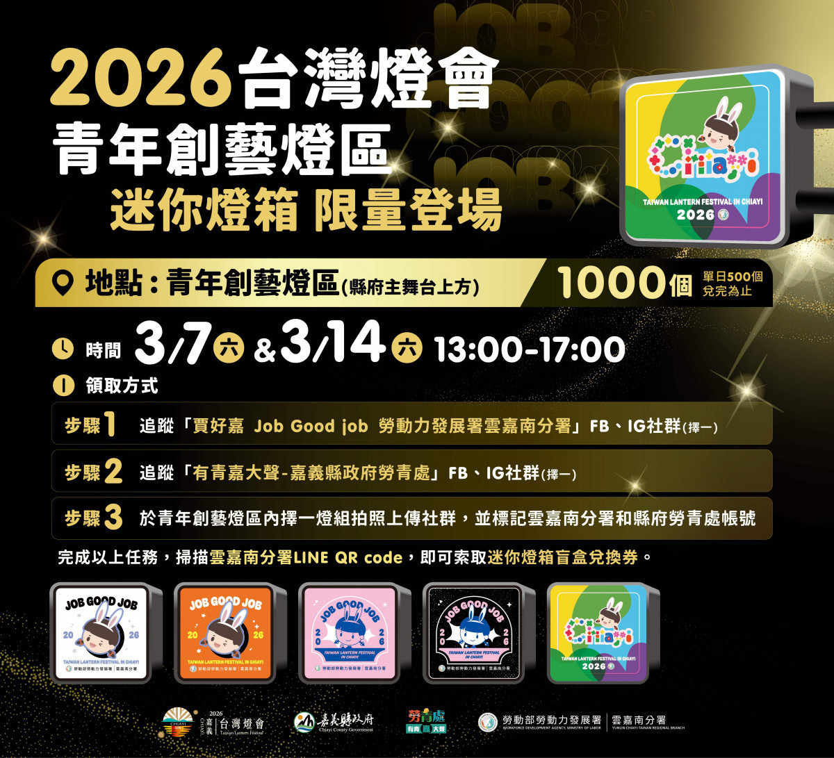 迷你燈箱是由嘉義縣政府勞青處與勞動力發展署雲嘉南分署合作,以分署專屬IP角色「賈好嘉」為主角,結合燈會繽紛視覺,打造「元氣IP」、「潮流復古」、「嘉義聯名」三大風格,並融入「Job Good Job」概念,象徵中央與地方攜手,陪伴青年點亮職涯每一步。