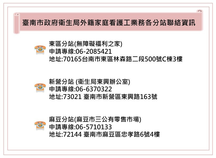 市民若有外籍家庭看護工申請或諮詢需求,可逕洽臺南市政府衛生局長期照護科各受理窗口:
