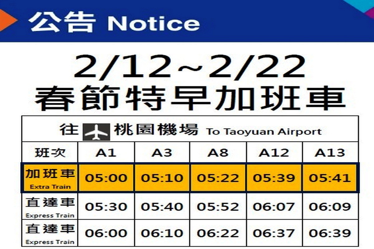 因應今(115)年早班機旅運需求再度提升,桃捷公司規劃於115年2月12日至22日,連續11天加開05:00自A1台北車站發車的特早直達加班車,沿途停靠A3新北產業園區、A8長庚醫院及A12機場第一航廈,並於05:41抵達A13機場第二航廈;因兼顧沿線居民生活品質,部份路段減速以降低音量,行駛時間約41分鐘。