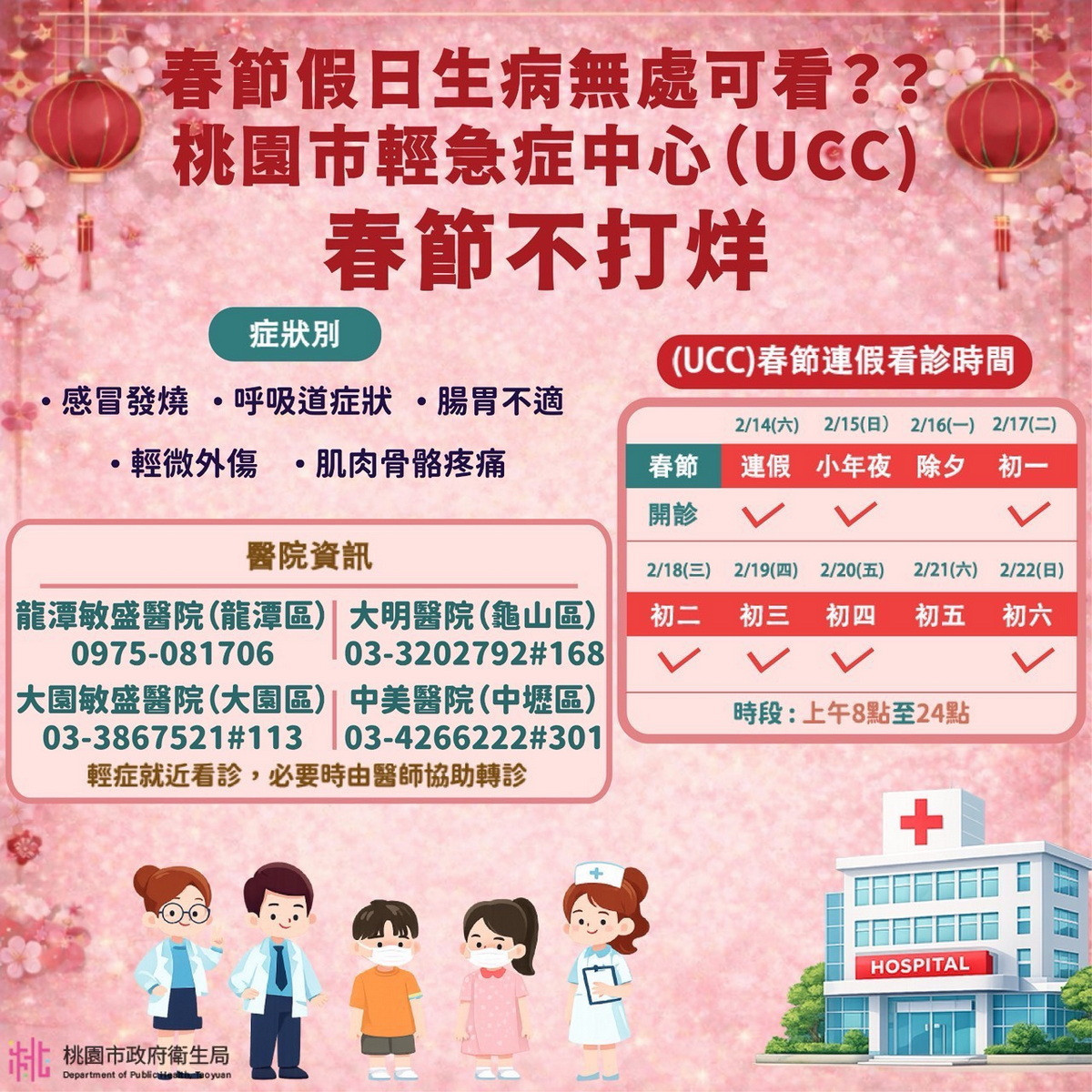 春節連假、週日和國定假日,診所休、急診擠,身體不舒服到底該去哪?桃園市衛生局12日提醒,桃園已設置 4處「週日及國定假日輕急症中心」UCC,每天早上8點一路看到午夜12點。感冒發燒、呼吸道症狀、腸胃不適、輕微外傷、肌肉痠痛——不用先衝急診,就近到UCC就能看。115年春節9天連假期間,UCC除了2月16日、2月21日 停診,其餘7天正常開設;另外2月28日和平紀念日也照常服務。