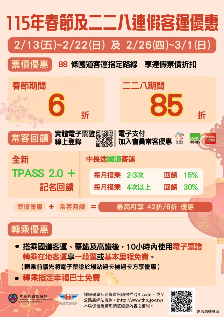 該站表示,為鼓勵民眾於連假期間搭乘公共運輸,紓解國道及觀光景點周邊道路交通壅塞,交通部公路局已規劃一系列疏運措施,以確保道路交通順暢,讓民眾安心返鄉團聚及出遊。民眾於115年2月13日至2月22日期間,搭乘指定國道客運路線可享受票價6折優惠(配合TPASS 2.0+ 優惠措施票價最高可優惠至42折)。
