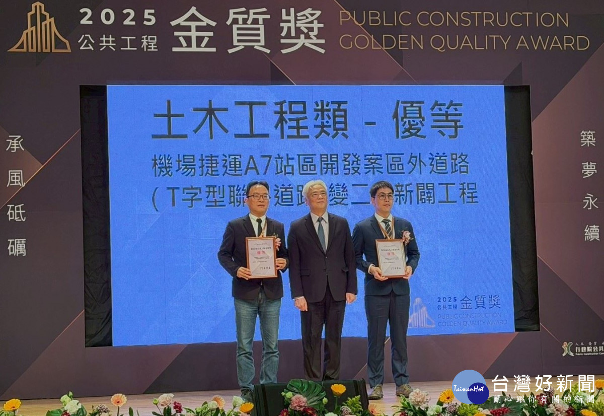 行政院公共工程委員會日前公布「第25屆公共工程金質獎」得獎名單並舉行頒獎典禮,表揚全國公共工程優良成果。桃園市政府新建工程處表現亮眼,共有2項工程脫穎而出,其中「機場捷運A7站區開發案區外道路(變二)新闢工程」榮獲土木類「優等」,「桃園市大園區菓林市地重劃工程」則獲土木類「佳作」,充分展現市府在公共工程規劃設計、施工品質及整體執行成效上的卓越成果。