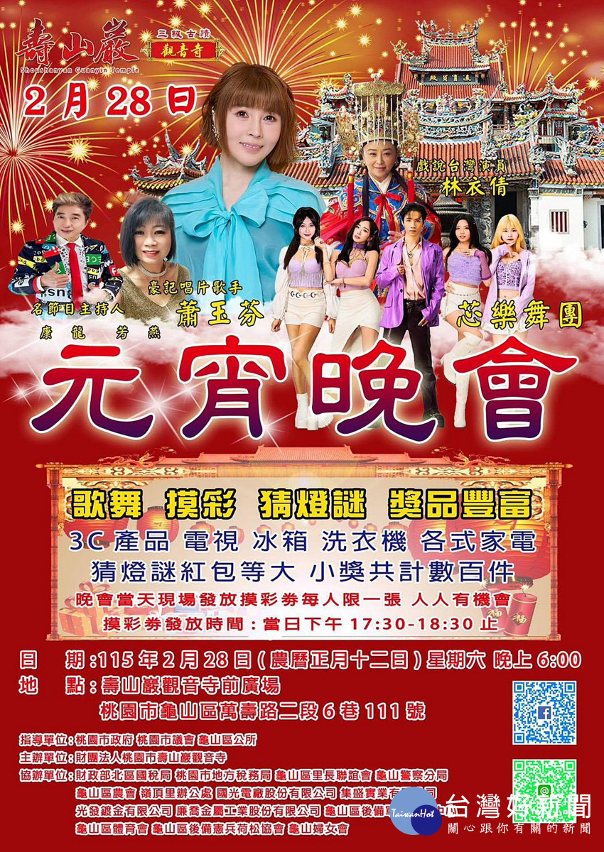 壽山巖觀音寺董事長 林明義24日表示,元宵晚會將於2月28日(農曆正月十二,星期六),於壽山巖觀音寺前廣場盛大舉行。活動當晚舞台節目精彩不間斷,歌舞表演輪番上陣,現場氣氛熱鬧歡樂,不論是親子家庭或長輩朋友,都能看得開心、玩得盡興,感受濃厚的元宵節慶氛圍。