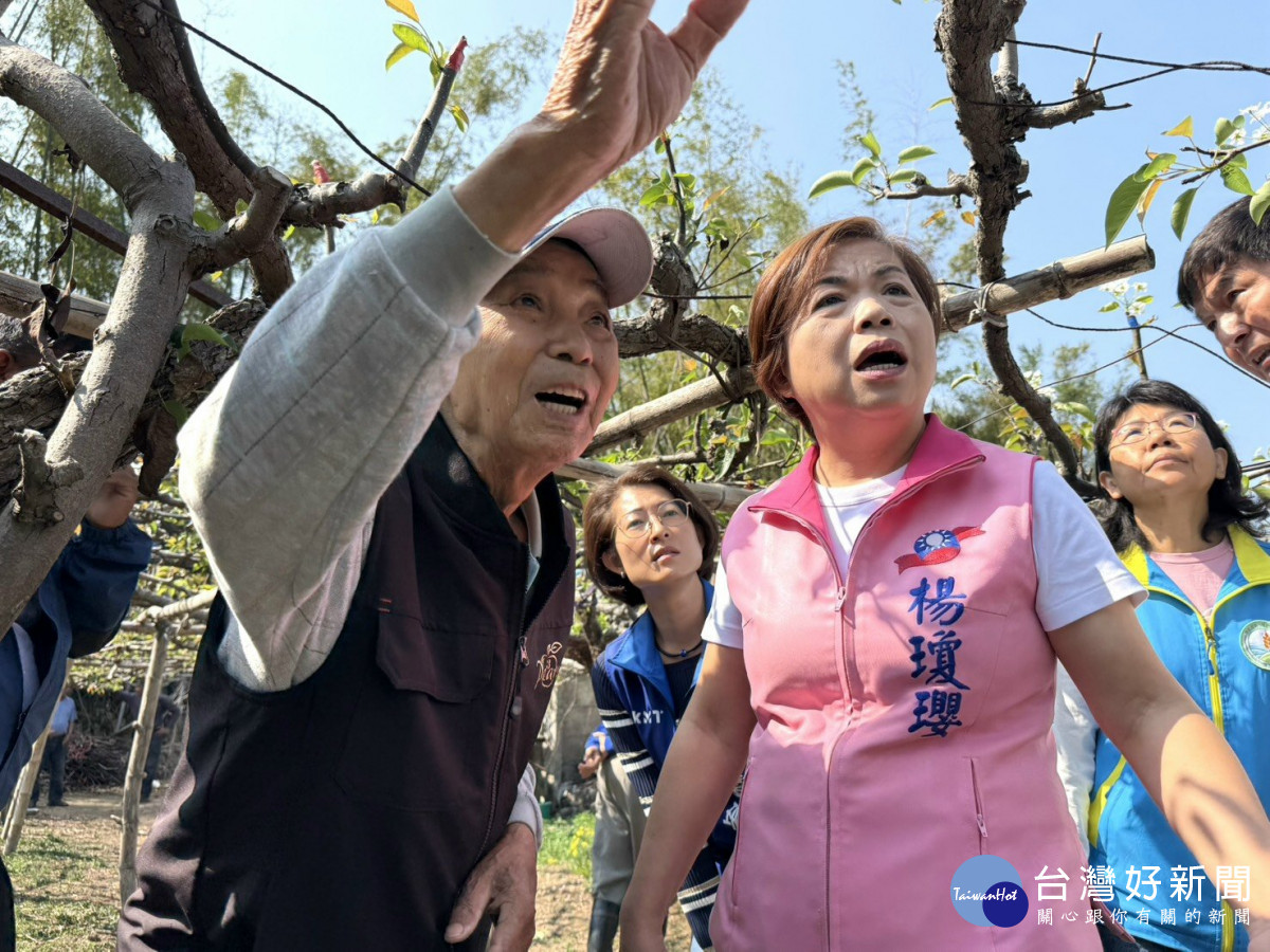 后里區目前種植高接梨面積約107公頃,過年前初步通報災損面積約0.6公頃,但年後災情持續擴大。為掌握實況,立委楊瓊瓔26日上午邀集相關單位辦理「后里高接梨梨穗災損」現勘,包括台中市議員陳本添、邱愛珊及農業部農糧署中區分署、台中區農業改良場、台中市農業局作物生產科與后里區農會等單位代表到場。
