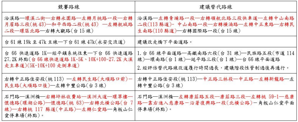 楊梅分局為確保選手及車隊安全,縝密規劃交通疏導及管制勤務,於台61線、中山西路三段、台15線及台66線實施交通管制措施如下: