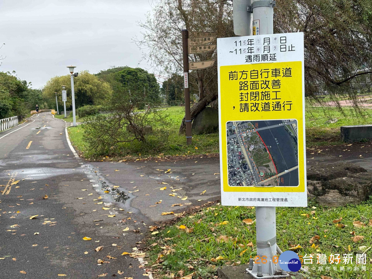 高灘處表示,江子翠自行車道(鄰板橋蝴蝶公園)為連接中和及板橋之間的重要自行車道,因部分路段受強降雨等環境影響,導致路面破損及位移。高灘處已在第一時間封閉並安排即日起至115年4月7日進行修繕工程,施工預計將舊有的路面打除更新。呼籲工程期間請民眾遵循現場告示或人員引導配合改道,造成不便敬請見諒配合。