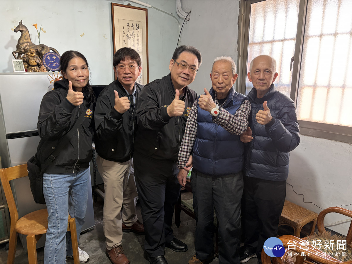 新竹榮服處處長鞠宗顯(中)與金伯伯(右2)及黎老師(右1)完成遠距居家照顧系統安裝。