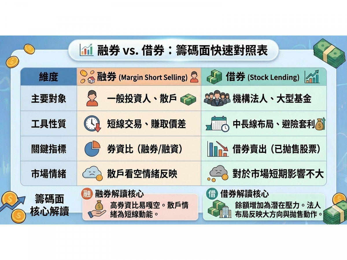 簡單來說,融券偏向觀察散戶情緒與短線動能,借券則反映法人布局與中長線方向。兩者搭配觀察,不僅能掌握軋空行情,也能看出市場空方結構,更完整判斷股價風險與支撐。