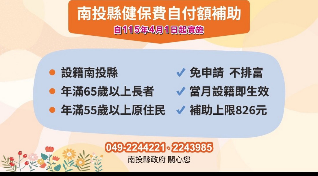 南投縣政府自115年4月1日起正式實施「老人全民健康保險保險費自付額補助計畫」,全面照顧設籍南投縣,年滿65歲以上長者及年滿55歲以上原住民,突破現行制度限制,落實高齡友善城市的政策承諾。