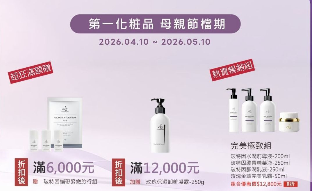 第一化粧品2026年母親節以「寵愛媽咪.特潤澎彈」為主軸,從日常保養出發,推出多重優惠與精選組合,希望讓保養不只是送禮,更是一種真正被照顧的感受。自4月10日起,全台直營門市母親節活動陸續開跑,精選套組最低75折起,並搭配多重滿額贈與折抵回饋,讓消費者在選擇保養的同時,也能輕鬆升級日常。