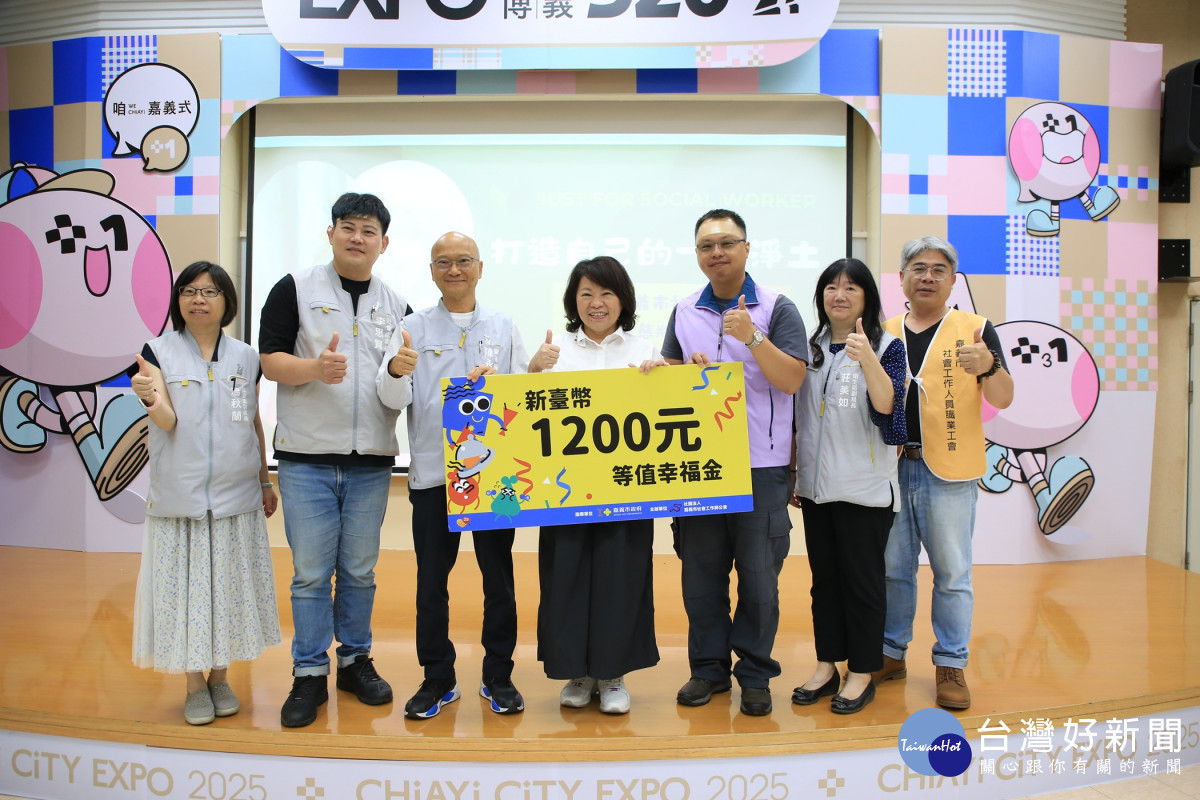嘉義市今天舉辦115年社工日慶祝活動暨啟動儀式,市長黃敏惠頒發加碼「等值1200元幸福金」給嘉義市全體社工人員/嘉義市府提供