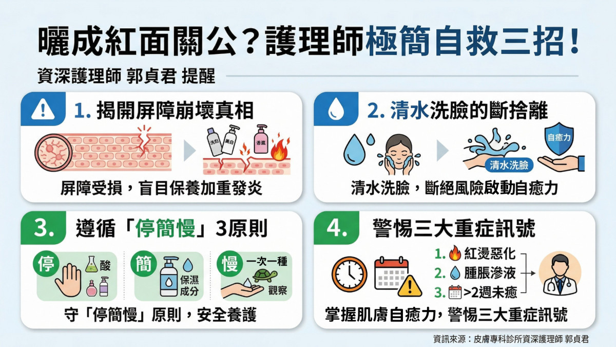 許多民眾曬紅後急著敷面膜、擦美白精華,卻發現皮膚更痛。郭貞君解釋,發炎中的皮膚屏障已損壞,存在肉眼看不見的「微觀破損」,此時塗抹成分複雜的產品,其中的香料、防腐劑或強效活性成分會透過角質縫隙過度滲透,引發「發炎大爆炸」。