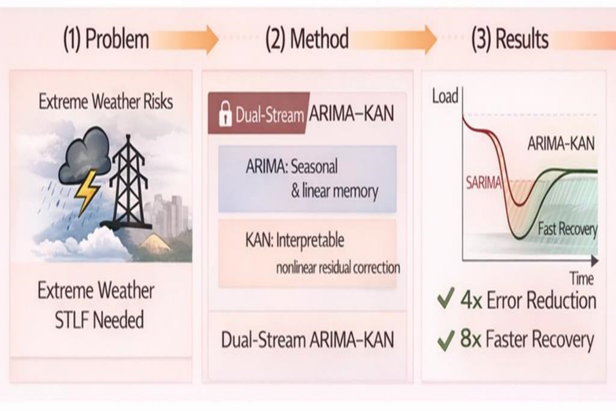 蔡尚恩副教授說明研究背景與技術特色,他指出,隨著全球極端天氣頻傳,如何在高波動情境下,維持電力供需平衡成為智慧電網的核心挑戰。研究團隊首先提出整合 ARIMA與人工神經網路的2階段預測架構,針對電力負載的規律性與節慶效應進行基礎分析。隨後進一步開發雙流季節性 ARIMA與 Kolmogorov-Arnold Network模型,強化對熱浪、颱風等突發性極端事件的判讀能力,使電力預測具備更高的解釋性與精準度。
