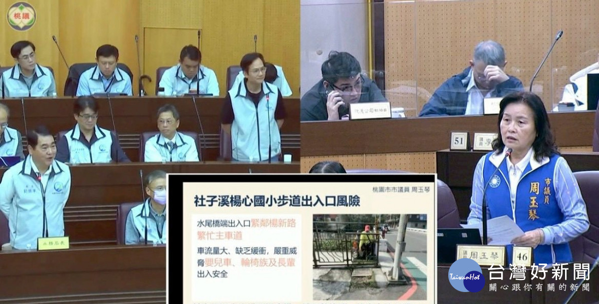 周玉琴質詢指出,楊梅區社子溪畔從楊心國小至水尾橋段的河岸步道,是當地居民重要的休閒場所。然而,水尾橋端出入口直接銜接車流量龐大的楊新路,由於缺乏適當的緩衝空間,導致嬰兒車及輪椅族在出入步道時,必須與主車道車輛擦身而過,險象環生。