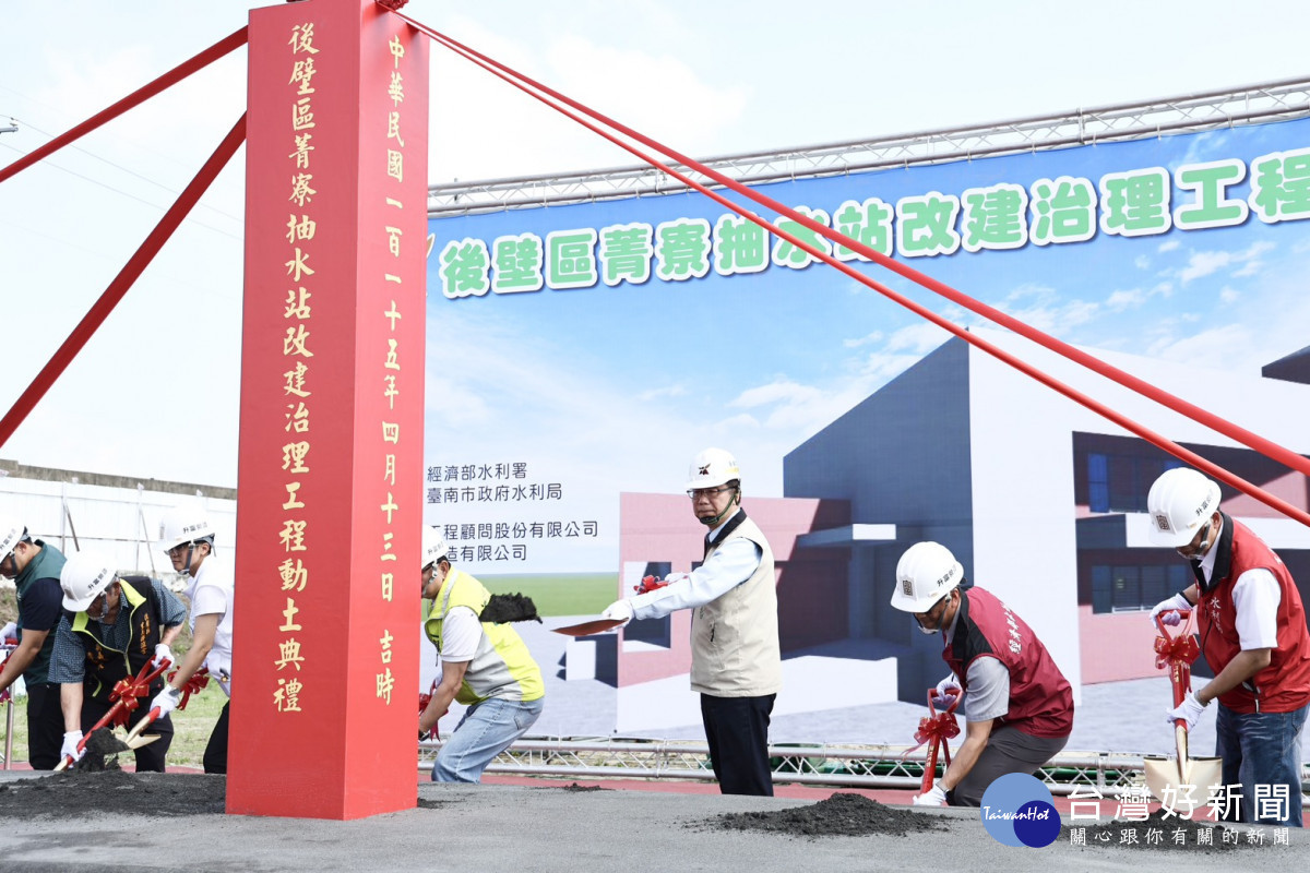 為強化溪北地區防洪韌性,台南市政府今(13)日舉行「後壁區菁寮抽水站改建工程」開工動土典禮,由市長黃偉哲親自主持。黃偉哲表示,完工後抽水量將提升至20CMS(每秒立方公尺),可有效紓解後壁及周邊地區積淹水壓力。