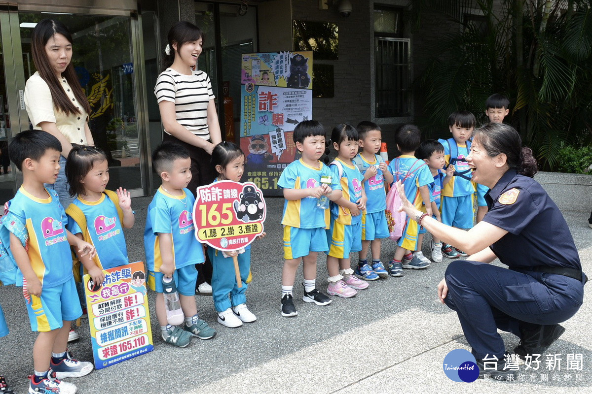 此次參訪學生多為幼兒園中、小班年紀,分局安排婦幼、交通安全、防詐騙、反校園霸凌宣導,另針對該年齡層設計宣導內容與徵答題目,並播放宣導影片告知小朋友絕不能在沒有家人陪同下獨自出門;過馬路要行走於行人穿越道,不只要遵守交通規則更要隨時注意周圍人車狀況;平時與家人都要小心提防詐騙訊息及陌生人誘騙。