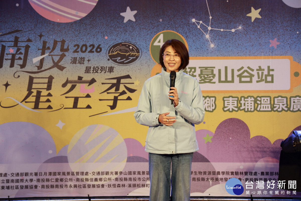 南投縣2026星空季首場活動「解憂山谷站」在信義鄉東埔溫泉廣場盛大登場,許淑華縣長邀民眾低碳追星。(縣府提供)