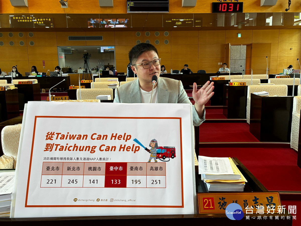 施志昌在質詢中引述消防署最新數據指出,截至114年底,台中市特種搜救隊人數僅133人,在六都橫向對比中位居末座。儘管台中特搜隊是中部唯一通過國家搜救能力分級檢測(NAP)「重型級」認證的隊伍,具備國際級技術水準,但現有人力已面臨極大挑戰。