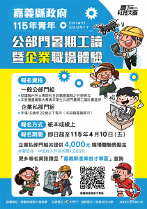嘉義縣政府推出「青年公部門暑期工讀暨企業職場體驗」活動,即日起開放報名,報名期間至4月10日(星期五)止,歡迎有興趣的青年朋友們踴躍參與。縣府指出,今(115)年企業職場體驗全面升級,除放寬參加資格,從原本18歲至29歲在本...