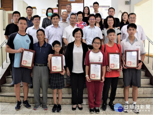 受獎學生由家長前往領取獎助學金及獎狀,並和電廠廠長許宗源〈右8〉及來賓等人合照留念。〈記者吳素珍攝〉
