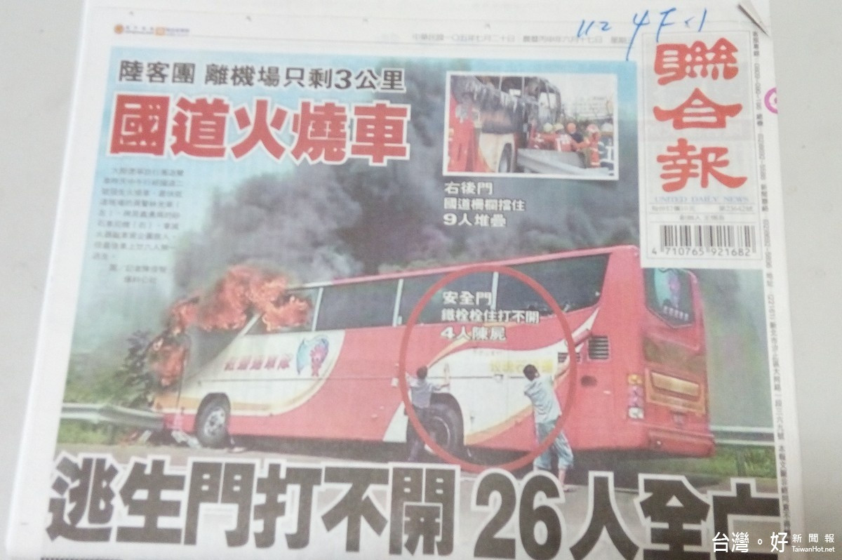 一輛搭載廿四名大陸遊客的遊覽車,昨天中午行經國道二號前往機場途中,在離機場僅剩三公里時,車頭開始冒煙,撞擊護欄後起火,遊客及駕駛、導遊等廿六人都沒逃出,命喪車上;多人堆疊在安全門及走道上,慘不忍睹。