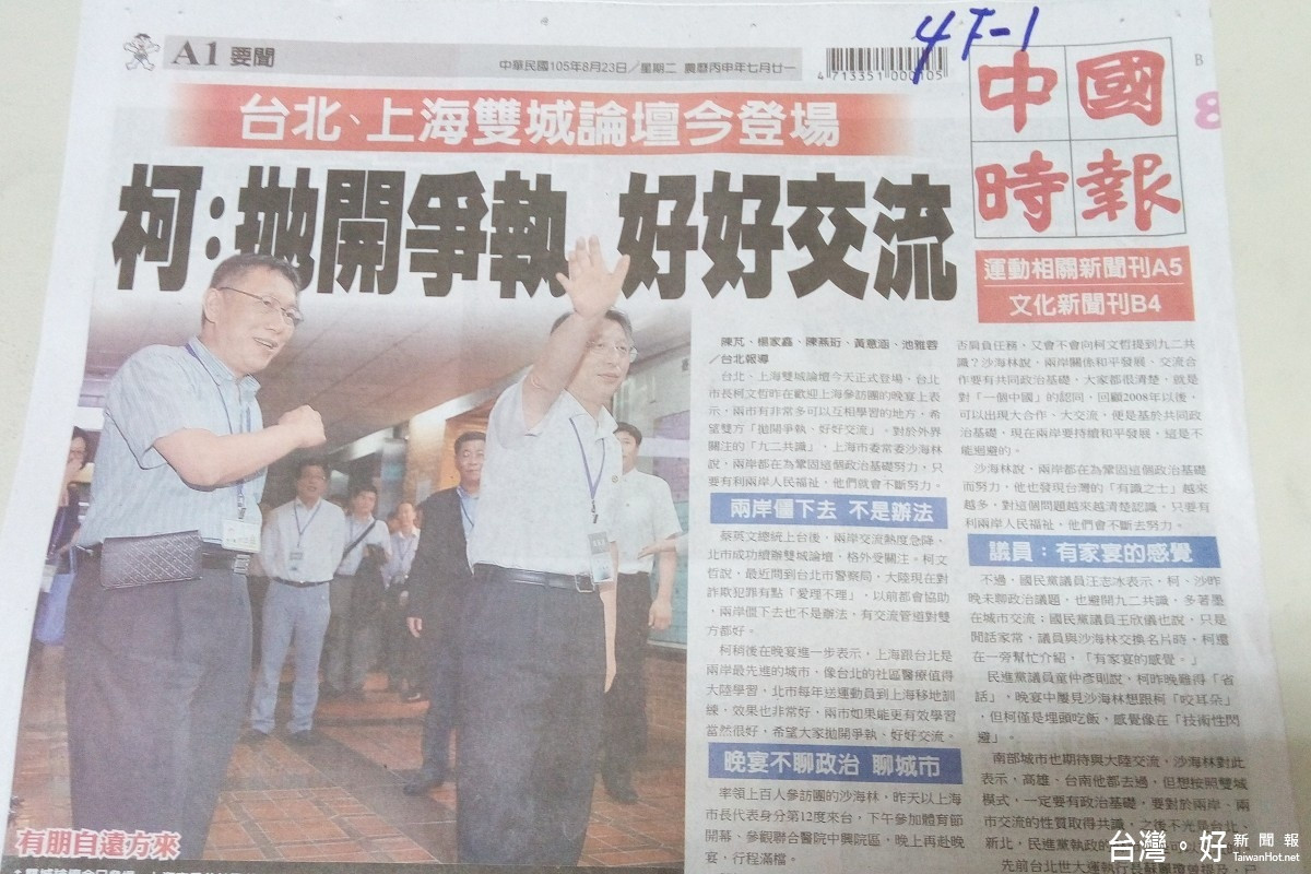台北、上海雙城論壇今天正式登場,台北市長柯文哲昨在歡迎上海參訪團的晚宴上表示,兩市有非常多可以互相學習的地方,希望雙方「拋開爭執、好好交流」。對於外界關注的「九二共識」,上海市委常委沙海林說,兩岸都在為鞏固這個政治基礎努力,只要有利兩岸人民福祉,他們就會不斷努力。