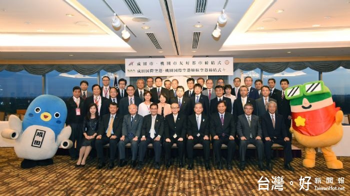 今日由成田市長小泉一成與桃園市副市長游建華簽署「桃園市‧成田市友好城市協定書」,成田國際機場公司董事長夏目誠與桃園國際機場公司總經理蕭登科締結「姊妹機場」,現場由駐日副代表郭仲熙、成田市議會議長伊藤竹夫、成田市議會副議長小山昭、中華航空股份有限公司董事長何煖軒見證。