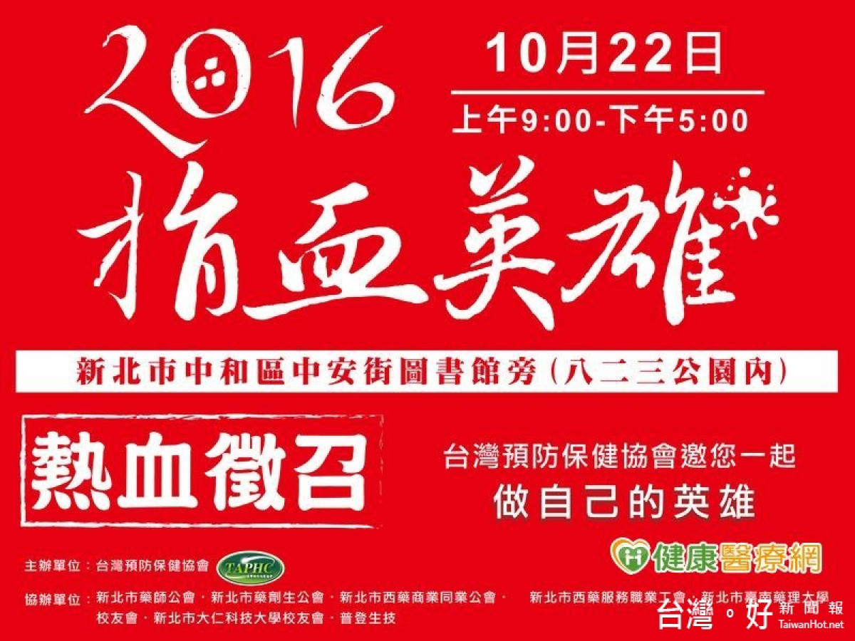 台灣預防保健協會訂於104年10月22日上午9點至下午17時,假新北市中和區中安街圖書館旁(823公園內,捷運中和線永安市場站步行約10分鐘),舉行《年度公益捐血活動》!本次特別募邀普登生技公司聯合實行公益,現場將限量提供捐獻者「乳酸菌牙膏2入禮盒」一只,鼓勵民眾踴躍慷慨挽袖,奉獻熱血!此外更是邀請新北市四大藥業(新北市藥師公會、新北市藥劑生公會、新北市西藥商業同業公會、新北市西藥服務職業公會)及新北市嘉南藥理大學校友會、新北市大仁科技大學校友會為協辦單位,將特設立用藥安全宣導區,提供民眾用藥安全諮詢服務,為社會公益活動共盡綿薄之力!歡迎民眾分享此活動訊息,捐血一袋,救人一命!