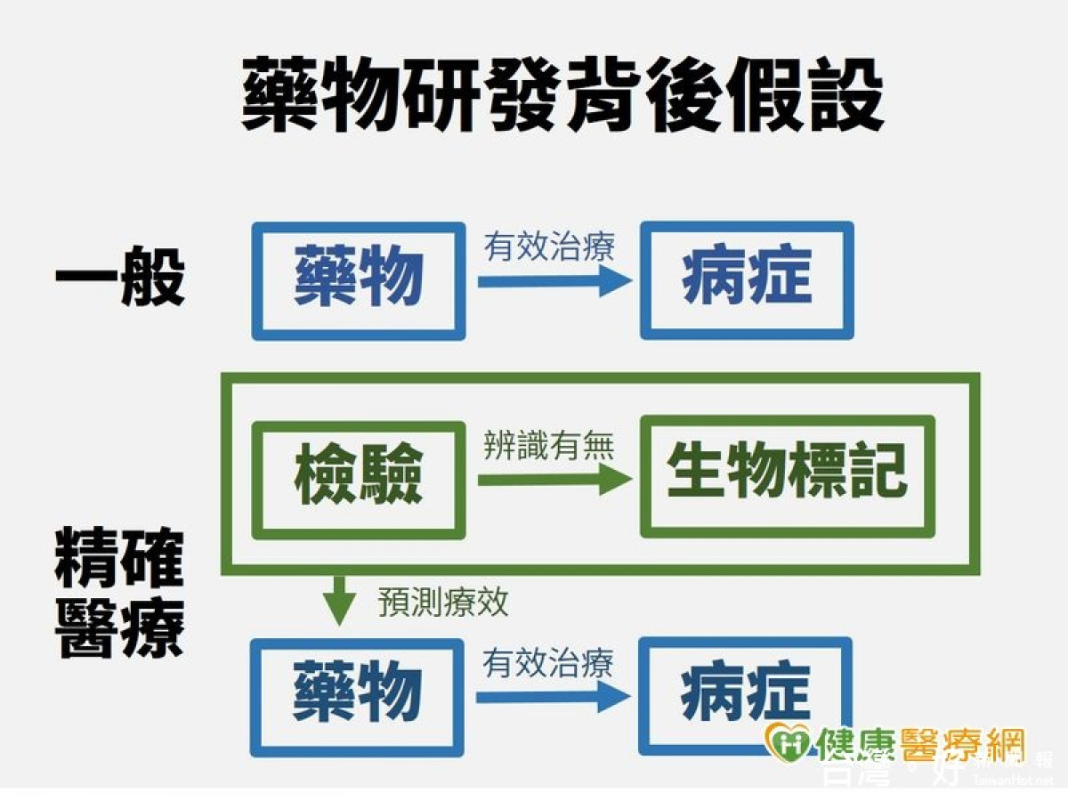 根據台灣醫學會資料,「精準醫療」是根據腫瘤基因型、個人基因表現、個人健康狀況,以及臨床資料等資訊,量身打造、選擇最適合患者的療程、藥物,或根據這些資訊擬定預防策略,透過這種治療方式,希望讓藥物發揮最大效果,並讓藥物副作用風險降至最低。
