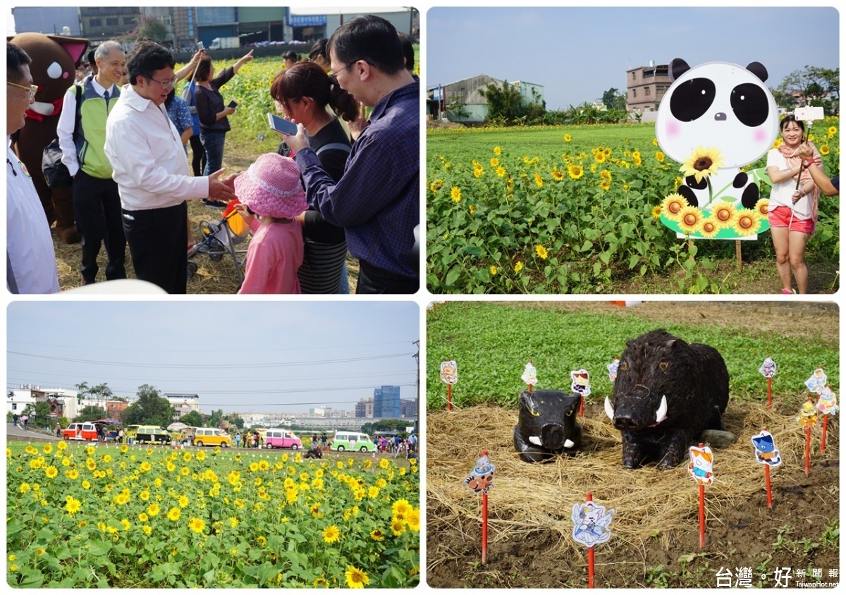 平鎮花彩節壓軸登場,民眾攜老扶幼湧入向日葵花田觀賞。