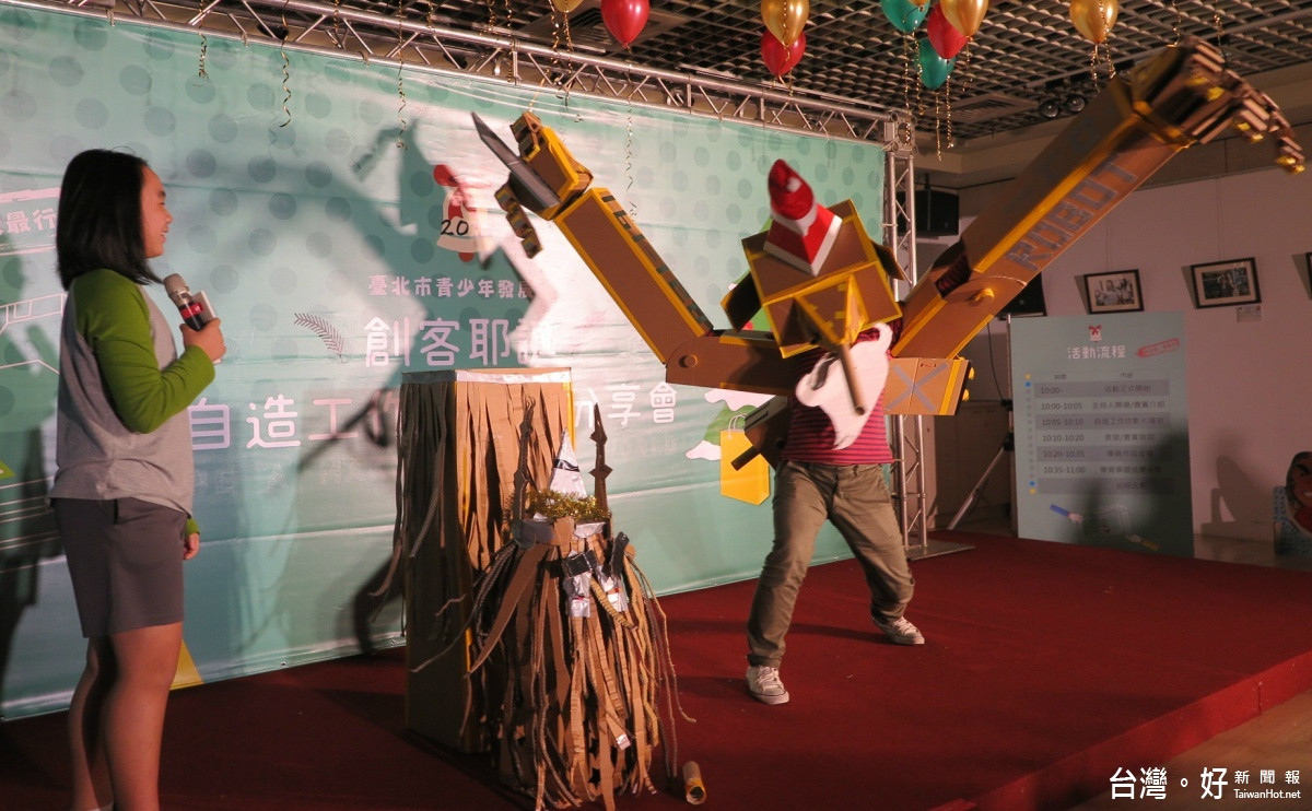 台北市青少年發展處今天早上十點舉辦創客耶誕「自己做.我最行」成果分享會,邀請前教育部國前署署長吳清山到場為發表作品的學子加油打氣,小Maker們現身說明自己的得意之作,向民眾展示充滿想像力的耶誕禮物,有「進擊的耶誕老人」、「聖誕老公公送貨好輕鬆」、「紙板鋼鐵人」等,這些禮物全是由國小4年級至國中2年級的青少年學生,運用家中原本要丟棄的回收物,藉由 3D列印、3D建模、雷射切割、紙製立體模型等多項創客技術,並結合Arduino電路板、馬達、LED、PLA環保素材及其他電子元件,自造出獨有的聖誕禮物。