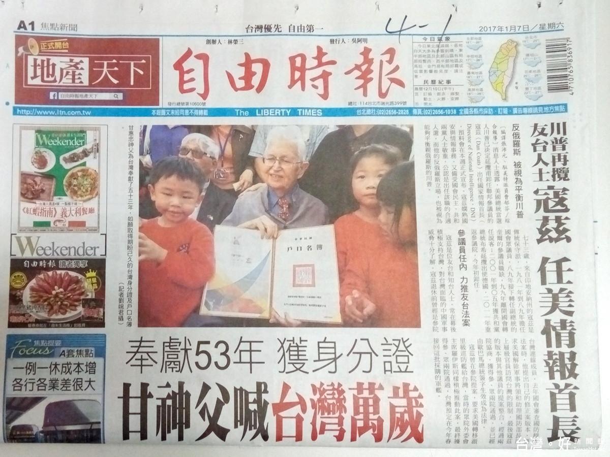 八十一歲的甘惠忠神父為台灣奉獻了五十三年,昨天從行政院長林全手中接過身分證,成為國籍法修正通過後的第一人,他開心地連續大呼三次:「台灣萬歲!」
