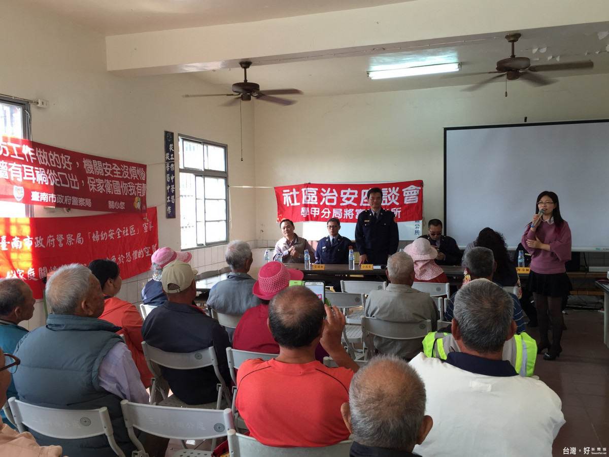 台南市政府社區治安專業輔導團隊,昨天結合學甲警分局社區治安會議,前進將軍區三吉里進行警政、社政、消防等聯合宣導,分局長鄭榮崑表示,親身感受到現場「務農為生、樂天知命」長者的可愛熱情,內心有感而發,強調責無旁貸的責任就是保護他們生命財產安全。