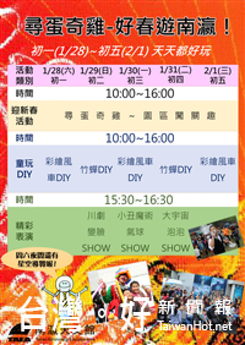 初二到初四連續三天下午更有川劇變臉秀、 小丑氣球魔術表演以及魔幻泡泡秀等精彩表演活動, 跟民眾趣味互動。歡迎全家大小樓頂揪樓下、厝邊揪隔壁, 一起來南瀛天文館走春迎雞年!活動詳情請上南瀛天文館網站, 查詢最新消息公告(http://www.taea.tn. edu.tw)。