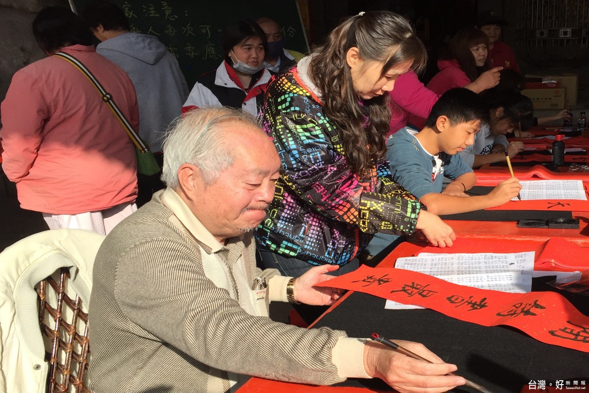 七旬老者薛鐘錤寫春聯送鄉親,薛老寫的書法作品法國博物館珍藏(記者/黃芳祿攝)