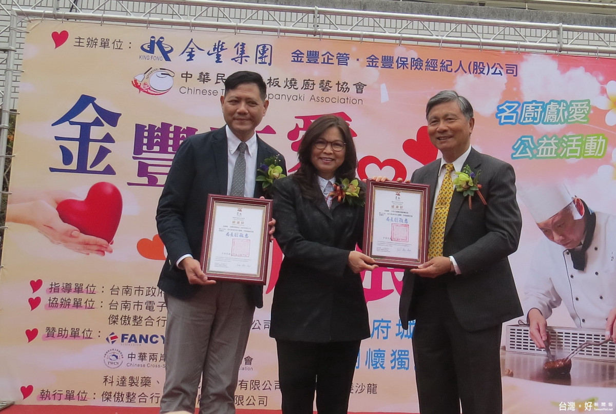 社會局長劉淑惠(中)頒發感謝狀表揚金豐集團董事長董峰豪(左)、中華民國鐵板燒廚藝協會理事長江廷芳(右)。(記者邱仁武/攝)