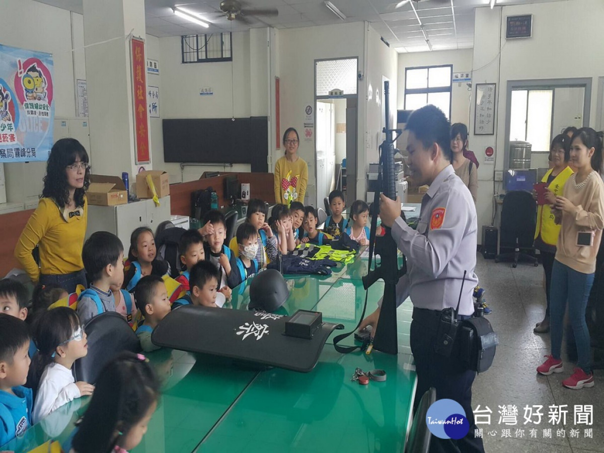 派出所預先將執勤時所使用的裝備防彈衣、反光背心、防彈頭盔、防彈盾牌、長槍等擺放於桌上,讓這群小小幼童參觀。當小朋友們走進派出所時,看到桌上擺了滿滿的警用裝備時,十分好奇的向前蜂擁而上,並由員警林名緯及周大維為他們解說警用裝備的使用功能和宣導交通安全法規。