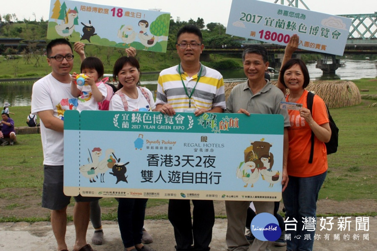 為慶祝宜蘭綠色博覽會今年18歲,主辦單位特別從5月3日起舉辦香江雙人自由行,只要從贈獎活動算起的第18萬名遊客,就是這份大獎得主,結果在5月12日11點32分,誕生幸運兒,是來自基隆市的李佳蓉,她與家人同遊綠博就獲得華航精緻旅遊贊助的香港三天兩夜雙人遊。