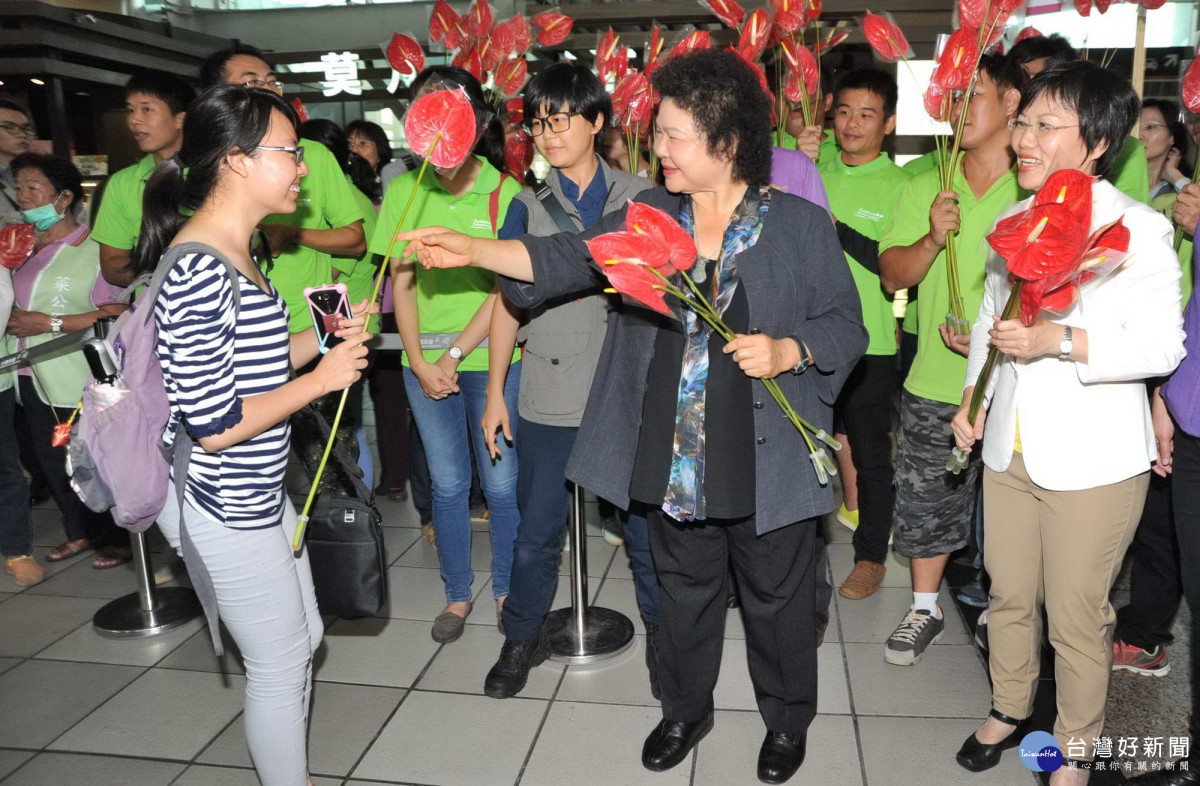 為迎接溫馨的母親節到來,高雄市長陳菊今(12)日晚間率市府團隊前往左營高鐵站大廳,親自將內門特產火鶴花贈予高鐵站遊客及返鄉過節民眾,祝福全天下偉大辛勞的媽媽們母親節快樂,並提醒大家要適時表達愛意、感謝母恩。