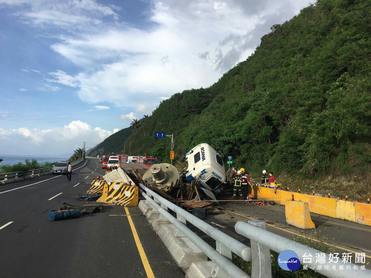 今天(16日)6時32分許由董姓駕駛營業曳引車由屏東往台東方向行駛,行經臺9線417K多良高架橋南端施工處,疑因精神不濟,擦撞紐澤西護欄,致失控衝入施工處,造成車頭幾乎全毀,所幸董姓駕駛意識清楚,整起事故肇因,由大武分局交通事故專責處理小組調查中。