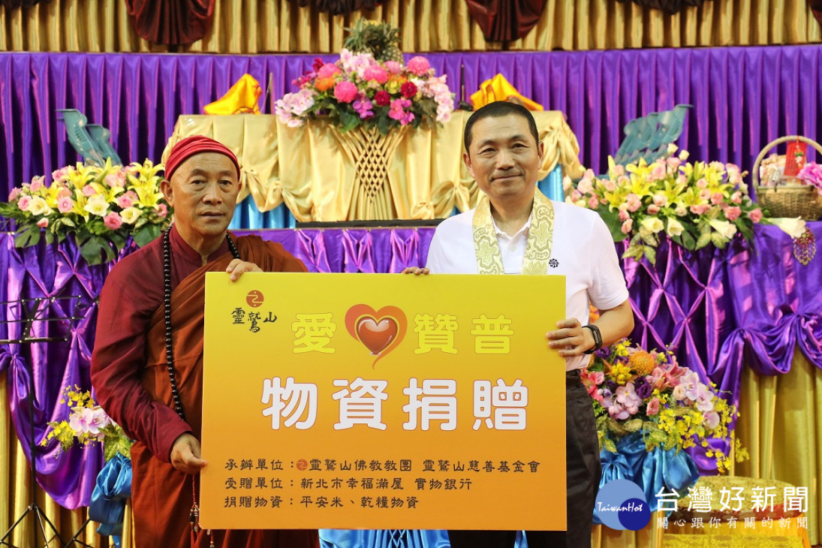 除了莊嚴殊勝的八關齋戒暨五大士瑜伽燄口法會,下午1點,心道法師與侯友宜副市長進行愛心捐贈儀式,把十方善信匯集的愛心物資捐贈給新北市府,包括:5千斤白米與食用油、乾糧等民生物資,再由新北市「幸福滿屋 實物銀行」、土城區公所、樹林區公所、林銘仁議員服務處、彭成龍議員服務處等單位,協助分送給需要幫助的家庭與團體。