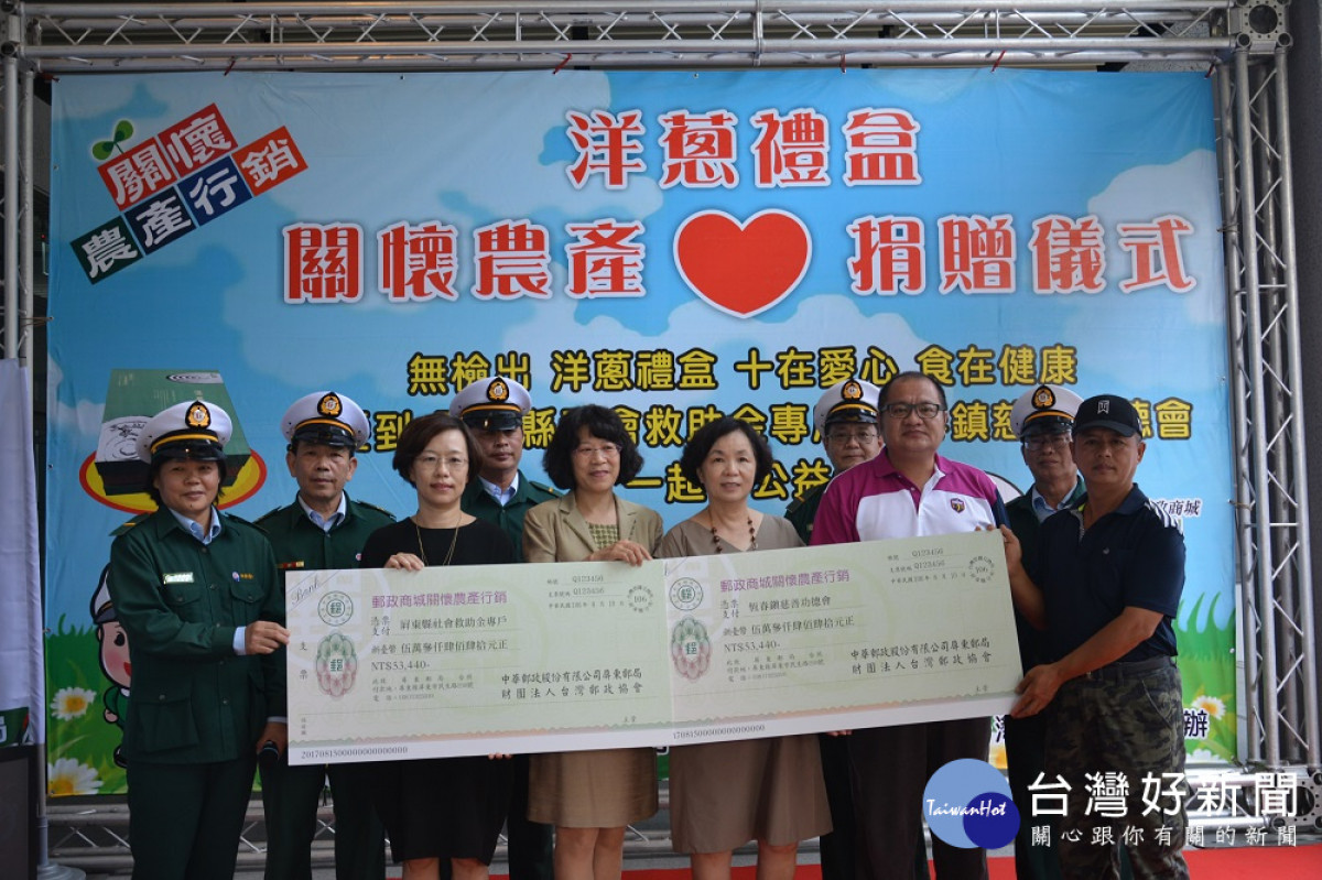 屏東縣政府10日辦理「關懷農產-洋蔥禮盒」捐贈記者會,由屏東郵局結合恆春洋蔥農民一起做愛心,販賣無毒洋蔥禮盒每賣出一盒即捐出新台幣10元做愛心,今年4月至 6月共賣出1萬0,688盒,可捐出10萬6,880元,本次義賣金額將分別捐給屏東縣社會救助金專戶及恆春鎮慈善功德會,讓屏東縣縣弱勢民眾獲得更多幫助。